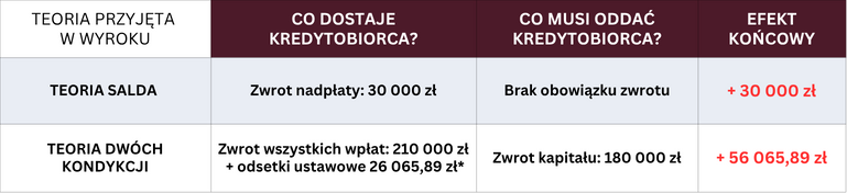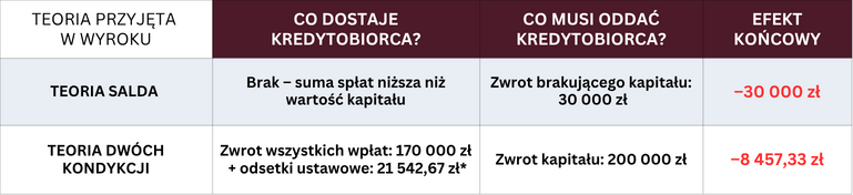 W zależności od koncepcji prawnej przyjętej przez sąd, sposób rozliczenia może wyglądać następująco: